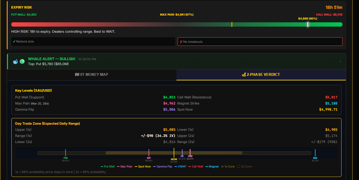 NEW YORK, Feb 19 (RTNewsWires) – Infinitum Institutional Terminal (IIT) predicts gold to be in a range as traders and investors awaits the US GDP and Fed’s favored inflation data, the PCE, on Friday the 20th that is also the last options expiry day for the week. As of this writing price ($4,998.71) is below gamma flip ($5,006) looking to target max pain at $4,962.00. Call wall is at $5017.00 while put wall is at $4,853.