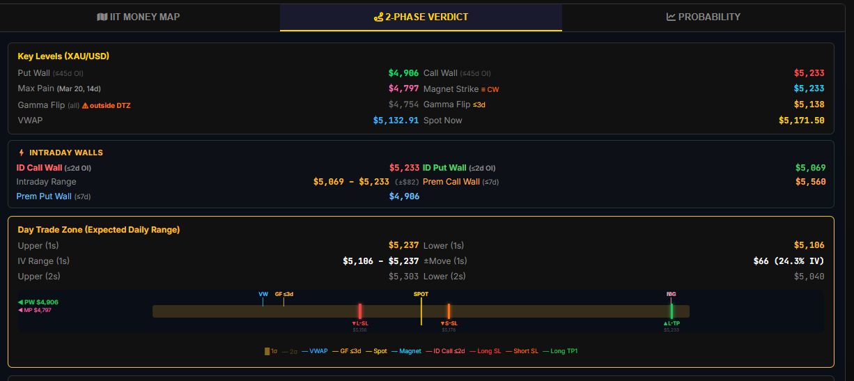 The terminal is an institutionalāstyle options intelligence platform for active traders. It fuses a realātime money-map, gammaāflip levels, and call/put walls into one view, so you can see where dealer positioning, options flow, and key risk pivots align. Our beta currently focuses on gold, letting you stressātest your edge before we expand to more instruments. It’s basically dealers’ positioning, decoded. Biiznillah.